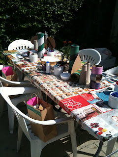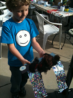 Kelly ran the Trash for Teaching party like she would a birthday party, which seemed like a much better alternative to a sweaty dude dressed up as Darth Vader. T4T can do theme birthday parties, like eco-superhero, garden or fashion. Each child gets a goody bag so they can work on more projects at home. It was impressive how much fun, energy and thought that Kelly put into the instruction. The kids loved her and had a great time making their projects, which was lovely because it gave the moms some time to chat.